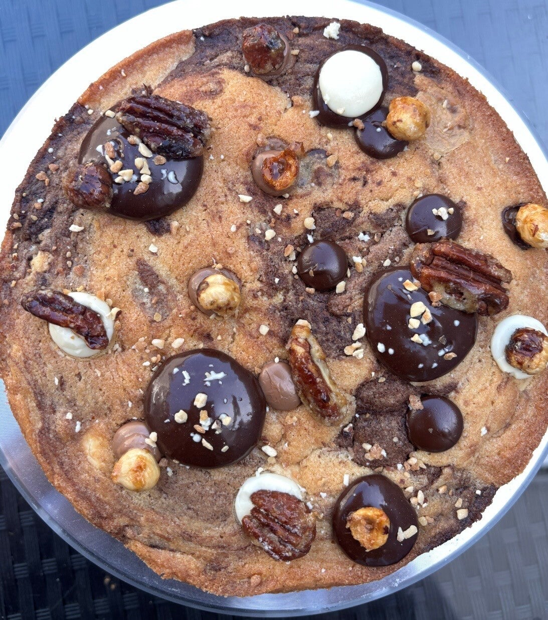 - Tarte Cookie (Pâte à cookie nature & chocolat, croustillant praliné, ganache montée au chocolat au lait, noisettes)